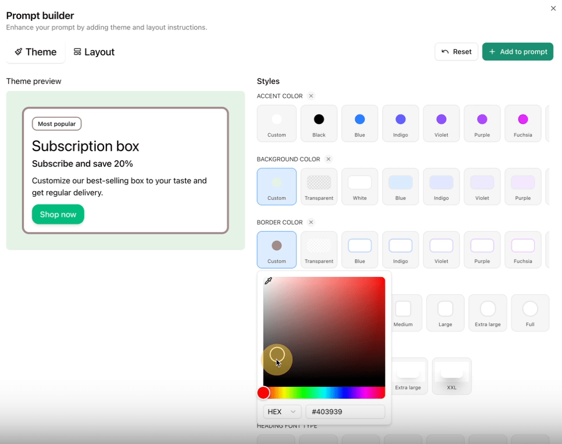 The builder then converts your selections into a structured prompt for the AI to execute, helping you launch visually consistent pages in fewer steps.