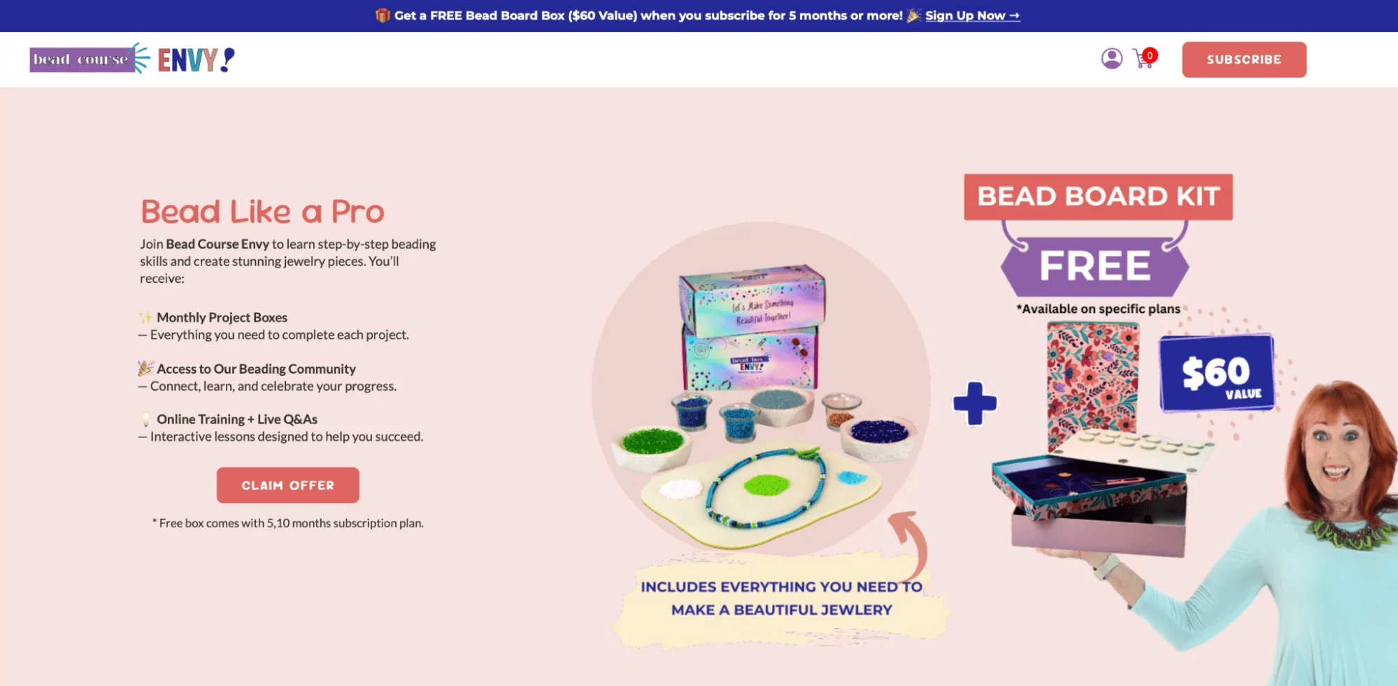 Bead Master Envy is an online training course and craft subscription for budding beaders. This subscription website knows exactly how to capture attention with its eye-catching pop-ups, design, and calls-to-action that easily convert new subscribers.