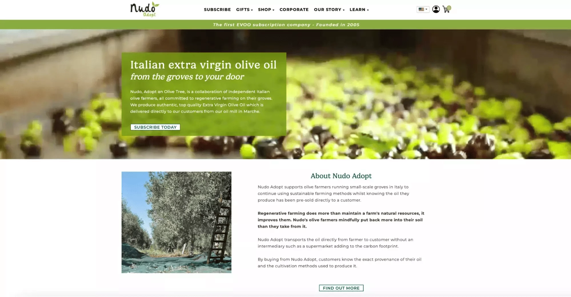 Nudo Adopt’s website offers a unique opportunity to adopt an olive tree from small-scale, sustainable Italian groves. The site effectively communicates its mission of supporting regenerative farming practices and allows users to easily explore adoption options, subscriptions, and related products.