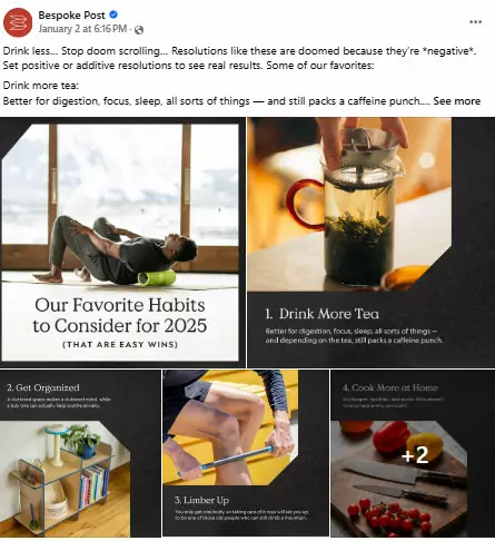 In the example below, the online D2C brand Bespoke Post has shared five positive resolutions its followers can make in the New Year.