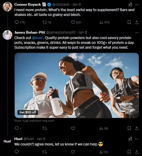 For example, the nutrition brand Huel often engages in relevant online conversations, responding to customer feedback, addressing concerns, and sharing user-generated content.