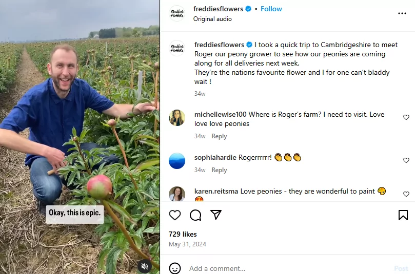 In the example below, the flower subscription service, Freddies’ Flowers has posted about a visit to one of its suppliers.