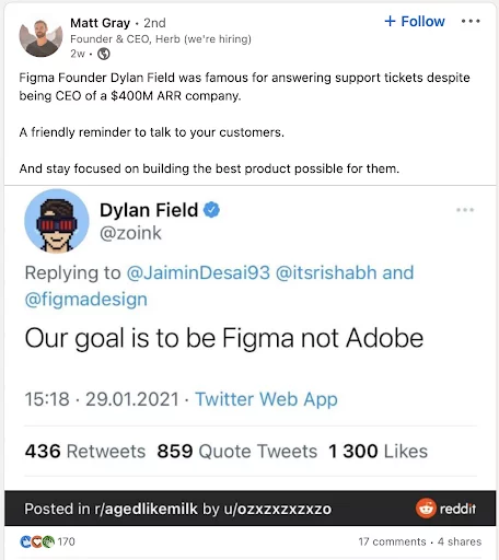 Take, for example, Figma’s CEO, Dylan Field. He became famous for answering support tickets well after Figma became a multi-million dollar company.