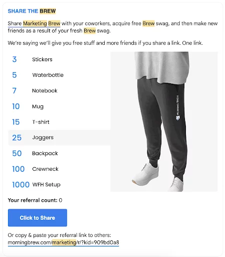 The final tip is less concrete but still vital. Find ways to add value to subscribers. Keep things interesting by offering discounts or promotions. Many subscription businesses will gamify the customer experience by offering merch in exchange for sharing affiliate links or enrolling in sweepstakes contests. Morning Brew is an example of a brand that has perfected this with their newsletter.