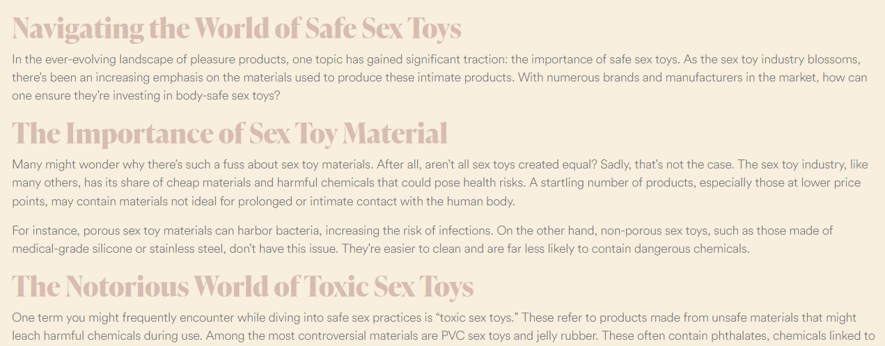 Here’s a good example, from Natural Love Company. They have created a guide to safe sex toys. It explains the difference between the materials that sex toys are made from and hygiene considerations.