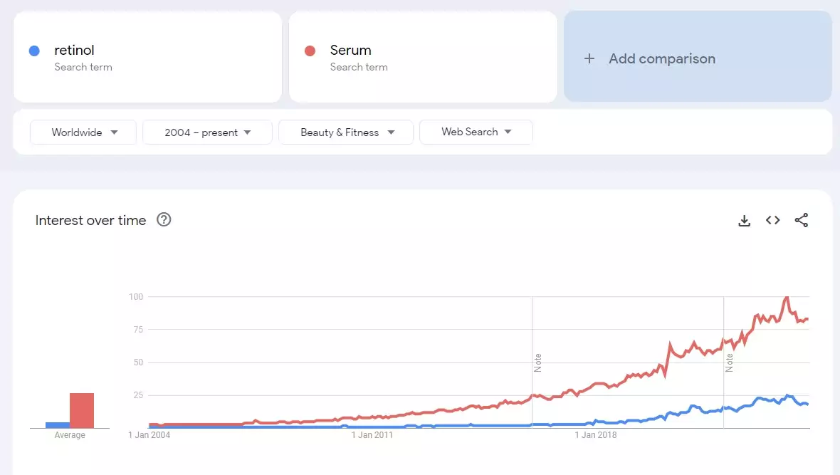 Simply type in a term like “retinol” or “hydrating serums,” and Google Trends will show you whether interest in that term is rising or falling, and you can even compare the popularity of these terms over time: