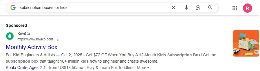 Here’s a good example on Google. We searched for “best subscription boxes for kids” and an ad for a monthly activity box from KiwiCo came up.