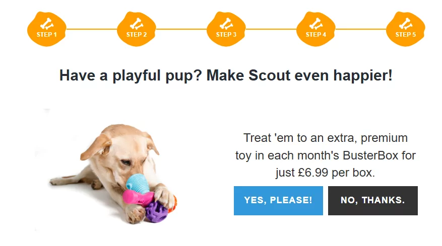 Subbly customer Busterbox presents its upselling offer during the initial sign-up process. This allows the company to quickly secure additional revenue from customers willing to spend more on their dog.
