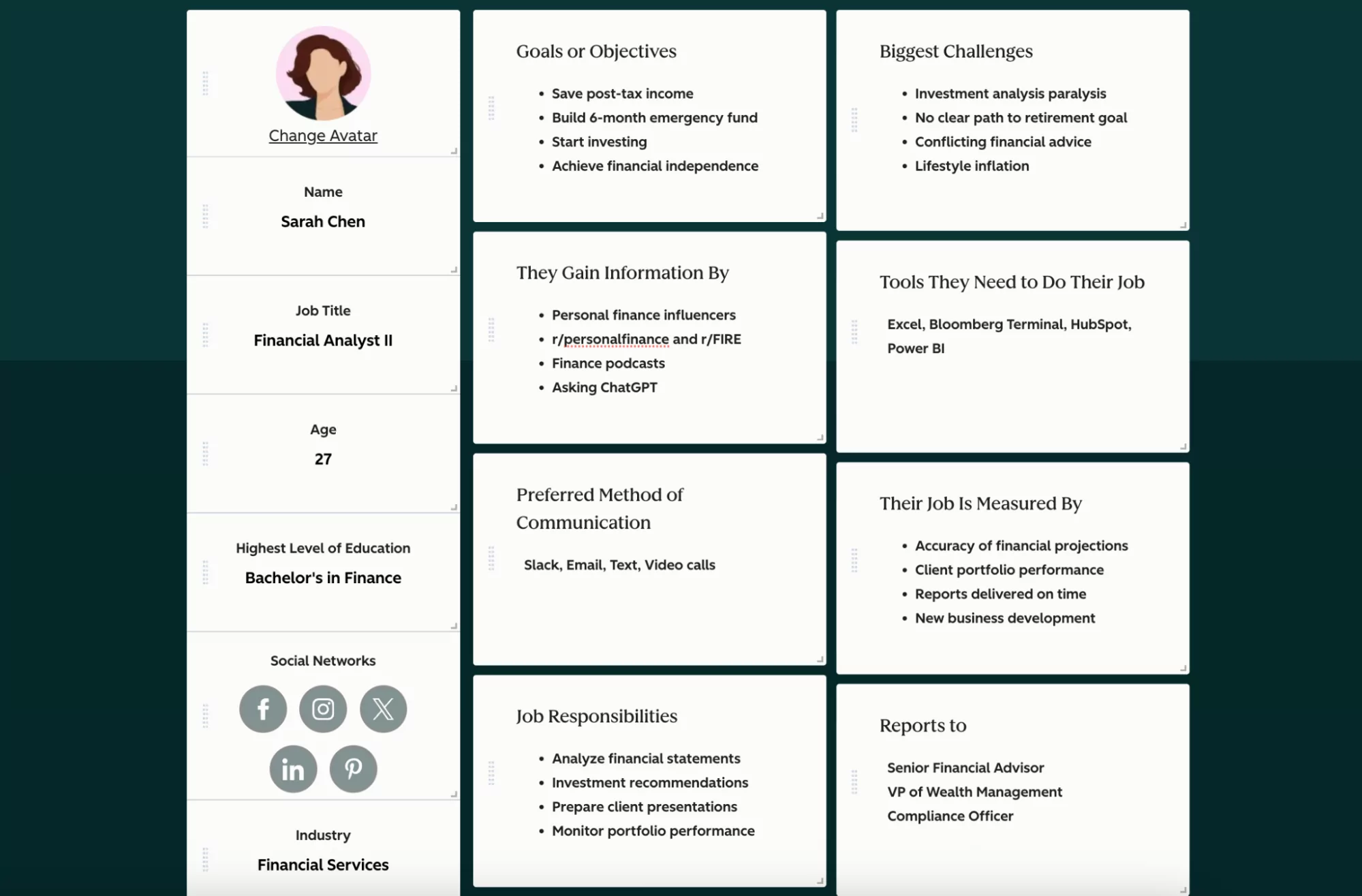 If you need help with this part of your strategy, Hubspot provides a free buyer persona generator. It allows you to create detailed personas, such as the one shown below.