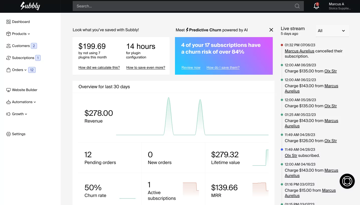 Predictive Churn AI is available as a paid add-on for $29/month. You can view the churn risk of your subscriptions on the subscriptions page. The top five riskiest subscriptions are available to everyone, even without the AI powerup. Want to try it for yourself today? Sign up for Subbly today!
