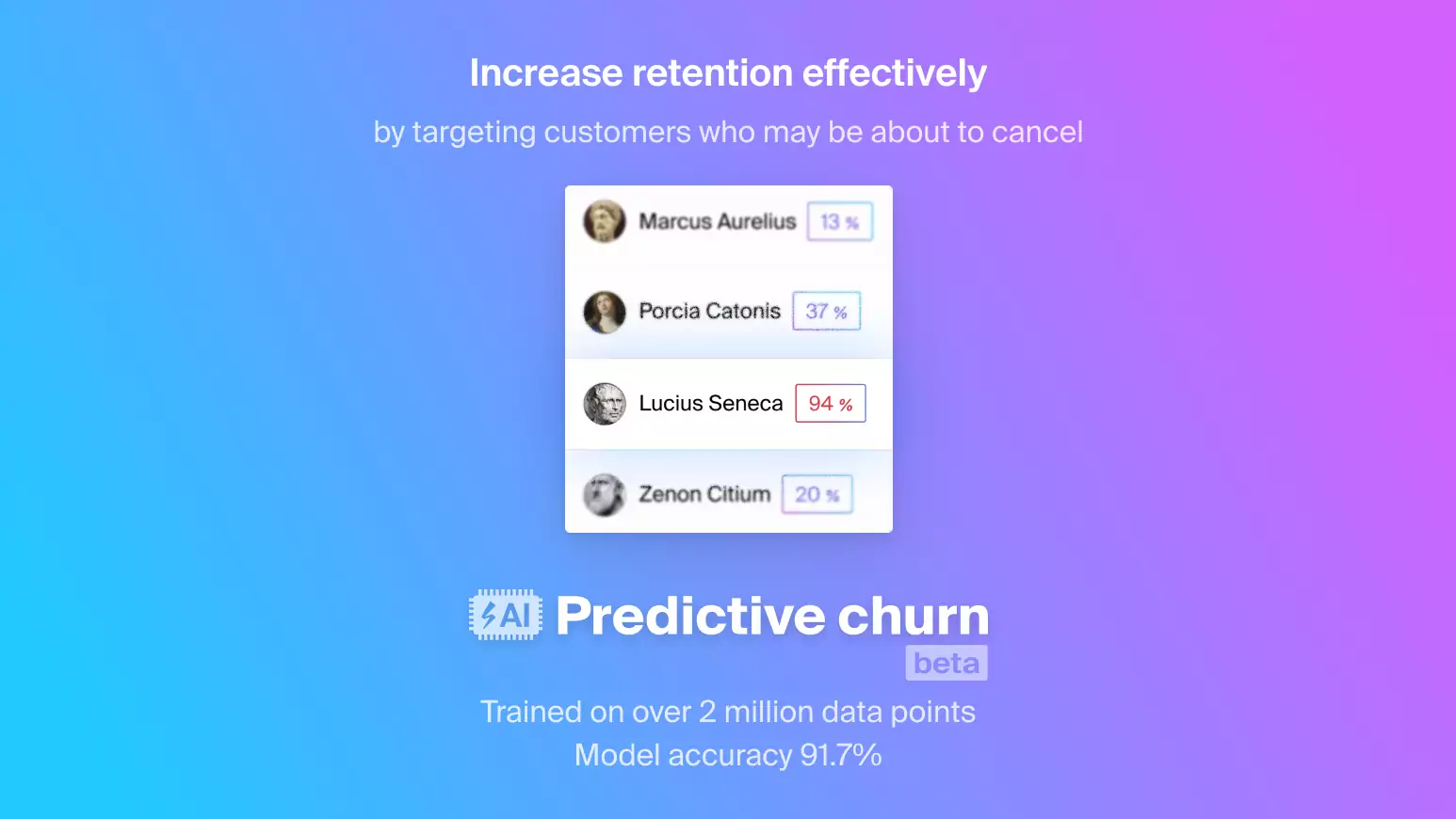 The model works by automatically collecting all the necessary data points for each of your subscriptions, and analyzing them against a vast proprietary database of over 2 million historical data points to return an individual churn risk (1%-99%) for all of your active subscriptions.