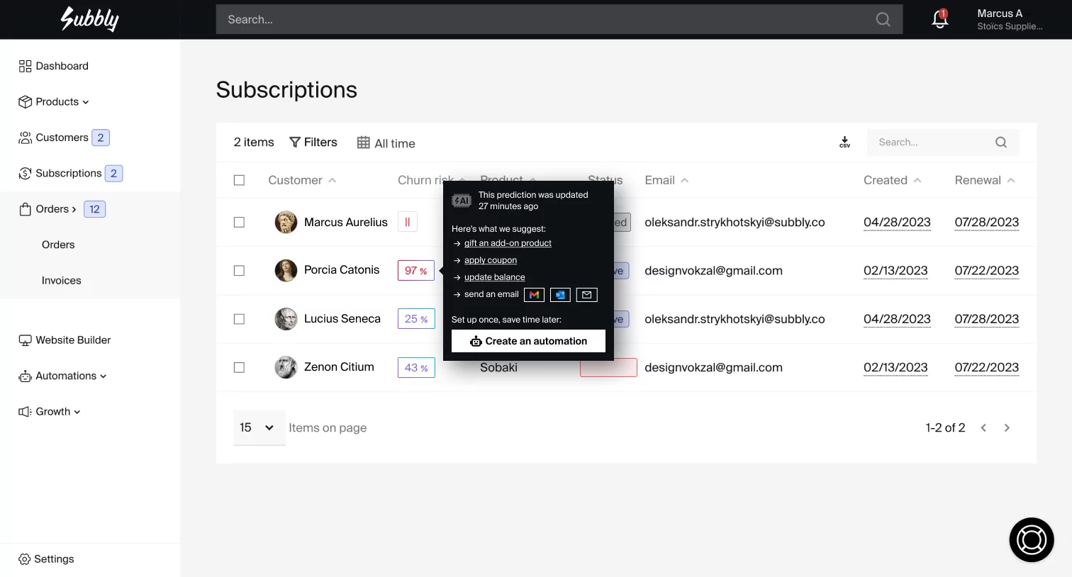 There’s a flip side to it too — Predictive Churn AI will also show you all your subscriptions with low churn risks, who are the perfect targets to upsell additional products to!