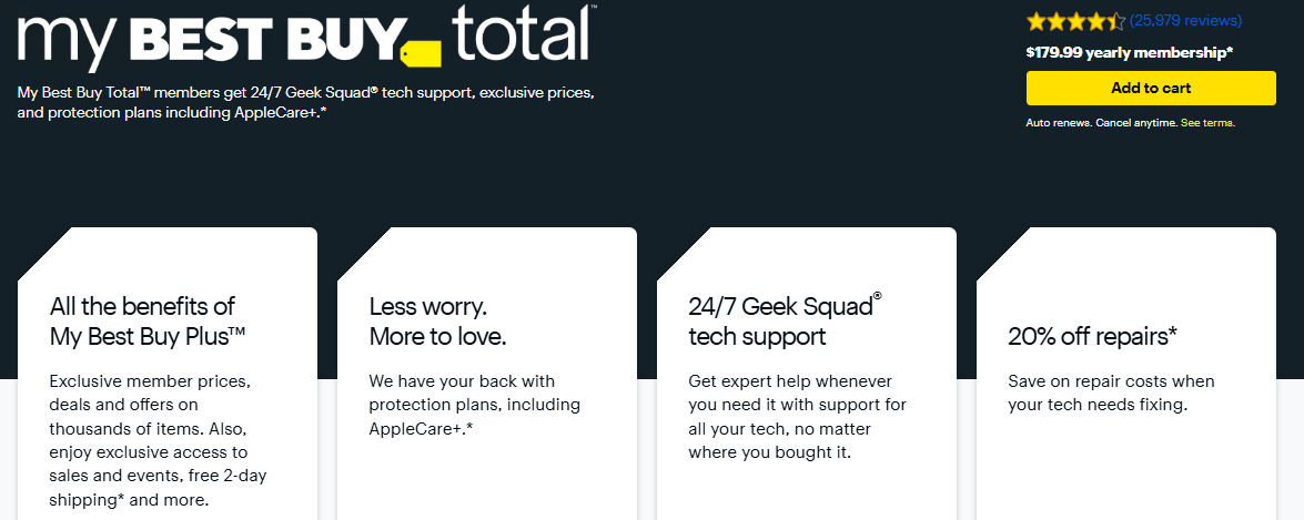 Best Buy Total is a paid membership from U.S.-based electronics retailer Best Buy. The program offers ongoing benefits for an annual fee.