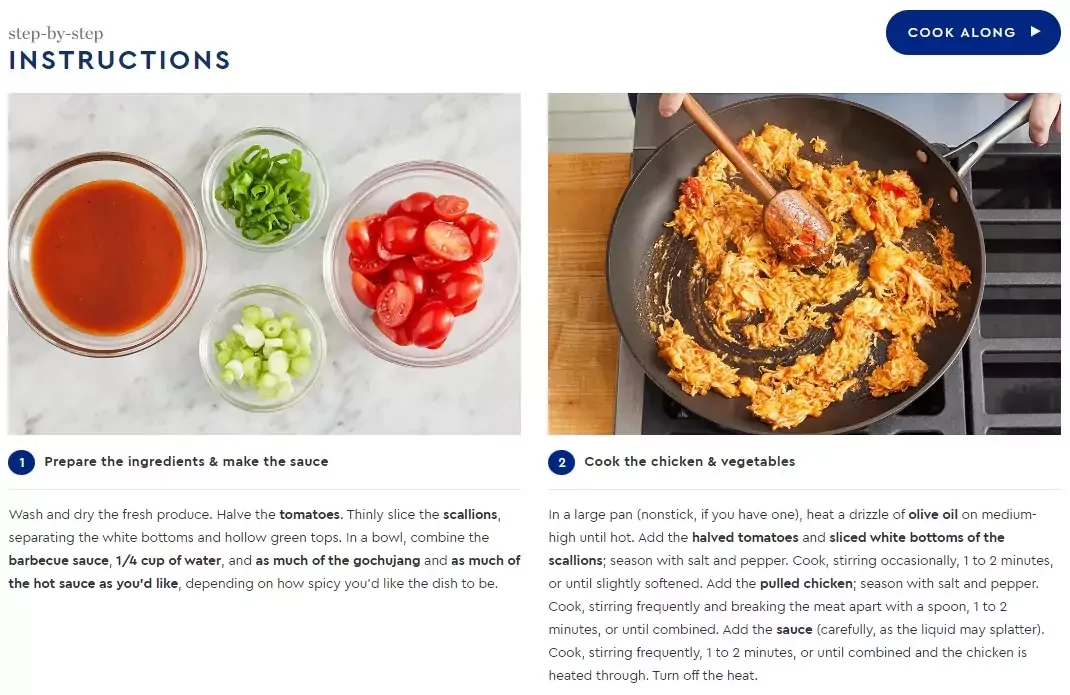 For example, Blue Apron offers spicy BBQ pulled chicken bowls, providing all the ready-to-cook ingredients and steps for preparing them.