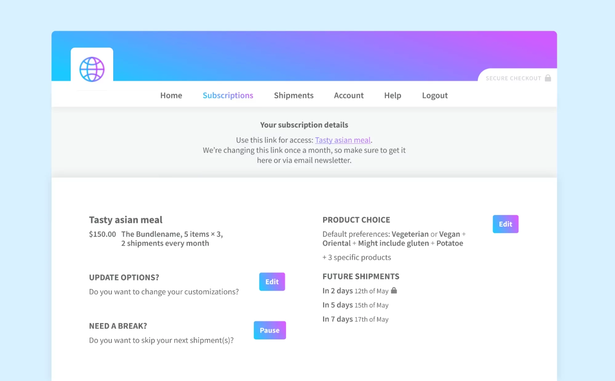 Here, you can see a customer portal that allows customers to view upcoming orders, manage subscriptions, and update their billing addresses: