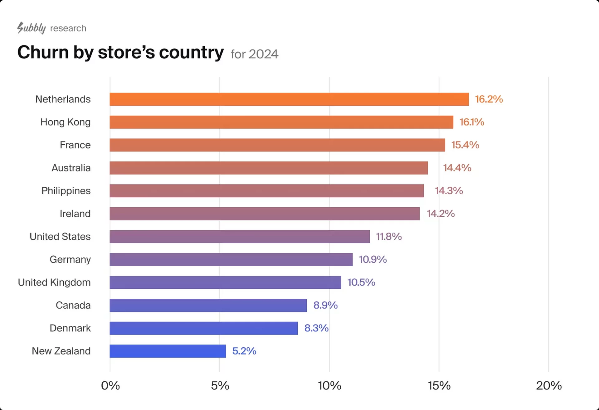 Churn rates also vary by country and product category. For example, stores based in New Zealand have a low churn rate of 5.2%. This figure is three times higher for similar businesses based in the Netherlands.