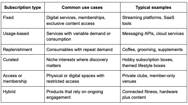 Choosing a subscription model starts with understanding what you are selling and how customers are likely to use it.