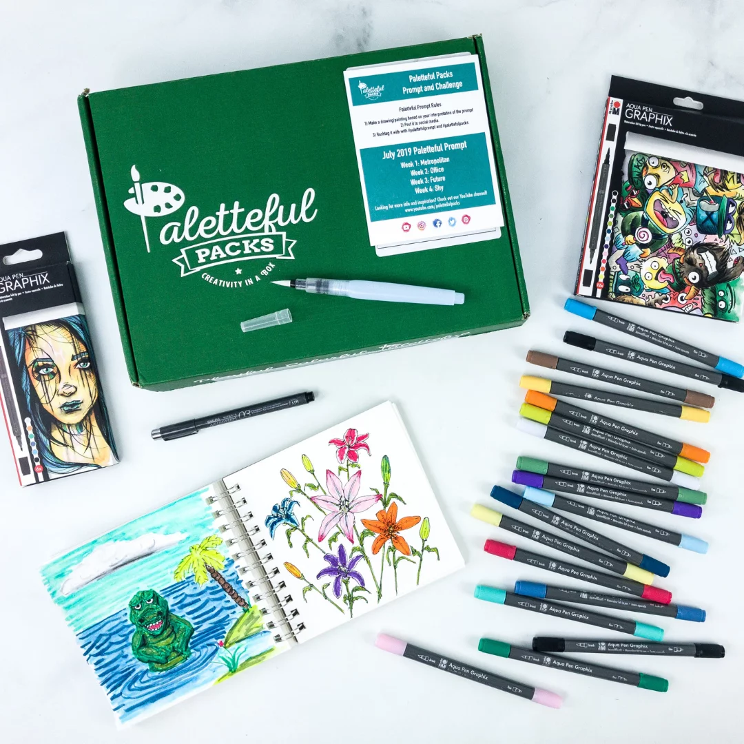 With Palleteful Packs, you’ll receive a themed box of high quality art supplies every month. Materials change from box to box, so one month, you might get graphite and charcoal, while the next you might get acrylic paint and pastels, and so on. Every box delivered comes with the complete set of tools and materials needed to complete the art project.